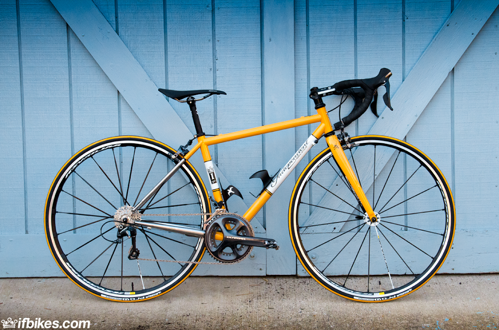 This Stainless Steel Road bike (SSR) was built for our very own graphics ninja, Ryan. The frame is drenched in freshly squeezed “Tangerine Scream” (by Ford – a perfect middle ground between orange and yellow) with crisp White panels and bold Black graphics. An inside/outside fork treatment reveals ENVE’s natural carbon goodness. Zesty!