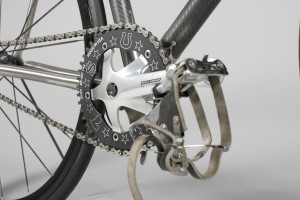 Phil Wood BB, Campy Record 165mm track crank with mounted 46t “Bling Ring” made by local chainring manufacturer 3RRR. In the rear is a 16t Euro-Asia “Superstar” track cog. Linking the two together is an Izumi “Super Toughness” track chain.